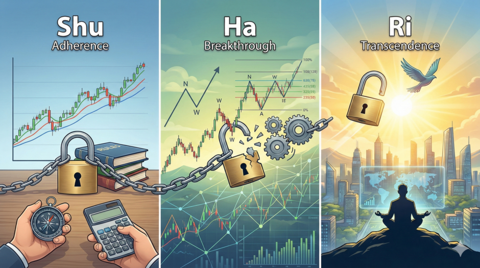 山本式トレード手法『守破離』が優れている点は、この人間の行動的欠陥を矯正するためのロードマップを提供していることです。この手法は、日本の伝統的な修練の哲学に基づき、トレードスキルを体系的に身につける三段階のプロセスを確立します。